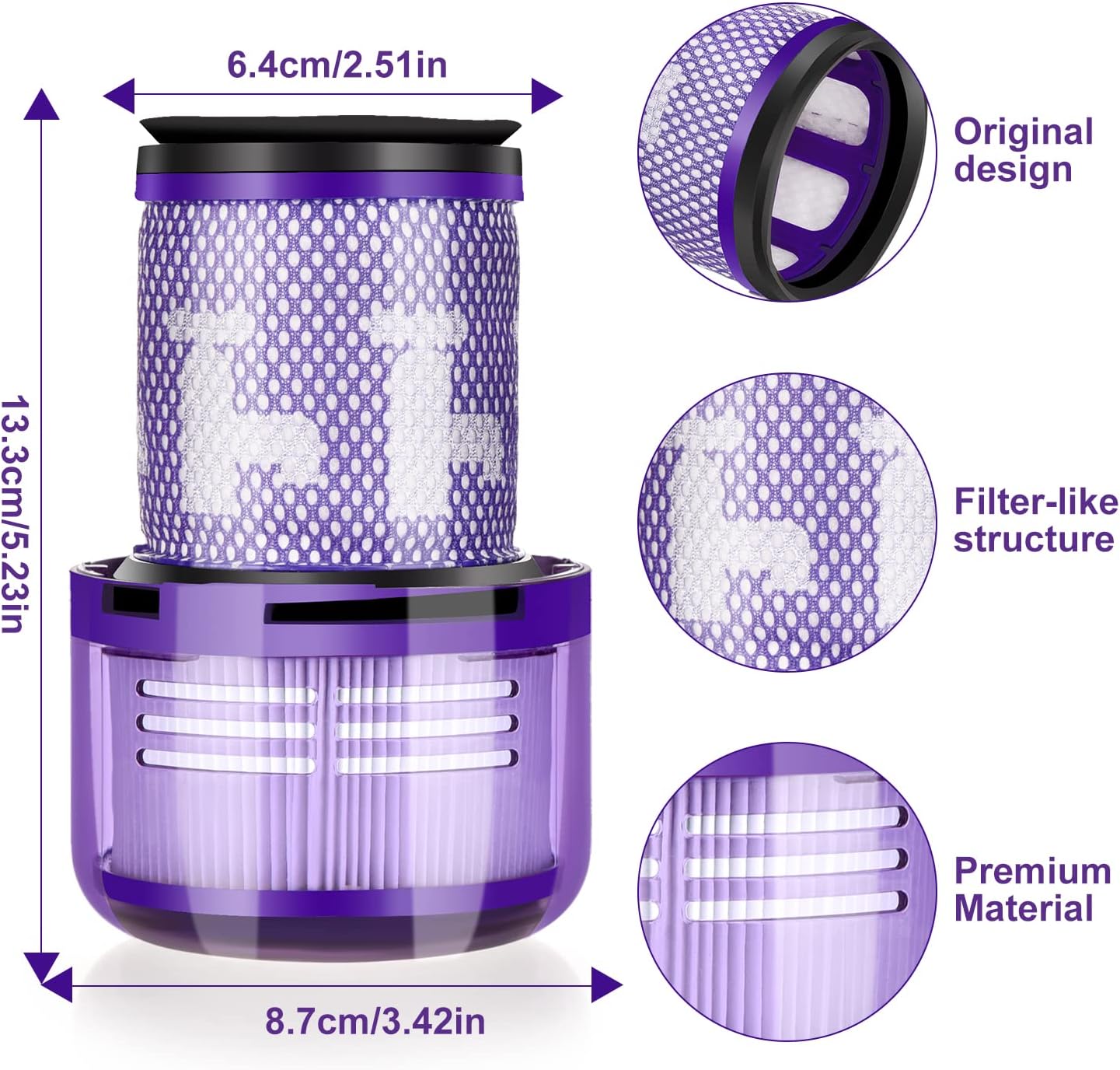 - H12 EFFICIENCY Filter for Dyson V12 Filter is made of high strength and environmentally friendly material to ensure the best performance of your wireless vacuum cleaner and keep your home clean and fresh. Since all HEPA filters comply with H12 standard, this V12 filter replacement can effectively remove dust and dirt from your home at 99.9%