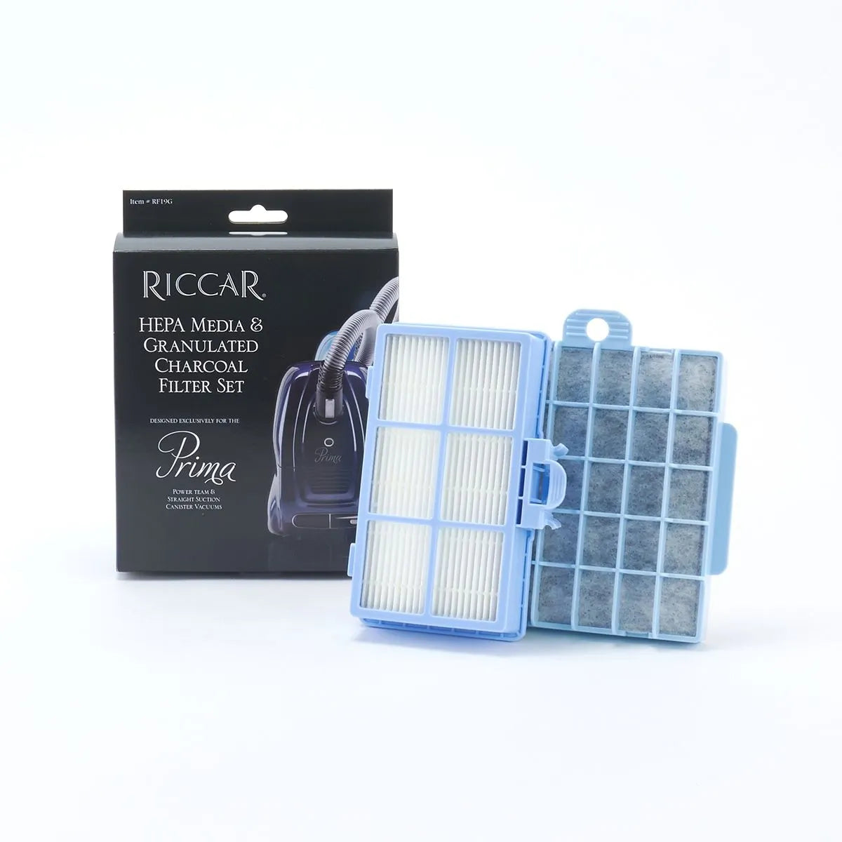 Riccar HEPA And Granulated Charcoal Filter Set Prima - Use this filter set for maximum control of particles and odors. The RF19G Premium Filter Set for Prima canisters include one pleated HEPA media filter cartridge and one granulated charcoal filter.