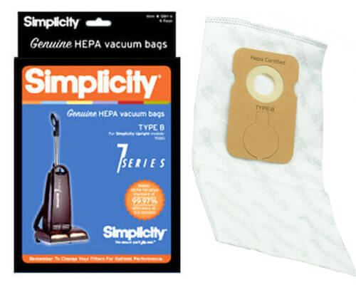 Simplicity High Flow HEPA 6 Pack 7000 Series 6 Case Type B - Simplicity Type B Genuine HEPA Vacuum Bags for Upright Models 7000 Simplicity High Flow Genuine HEPA Bag – S7-6 Type B Bags This bag will fit all of the Simplicity 7 Series models: Series 7 models 7700, 7750, 7850 7000 Series- models 7200, 7250, 7300, 7350, 7400, 7450, 7900, 7950. Also fits 8900, 8920, 8905, 8955, 8925 Models, Simplicity S7-6,